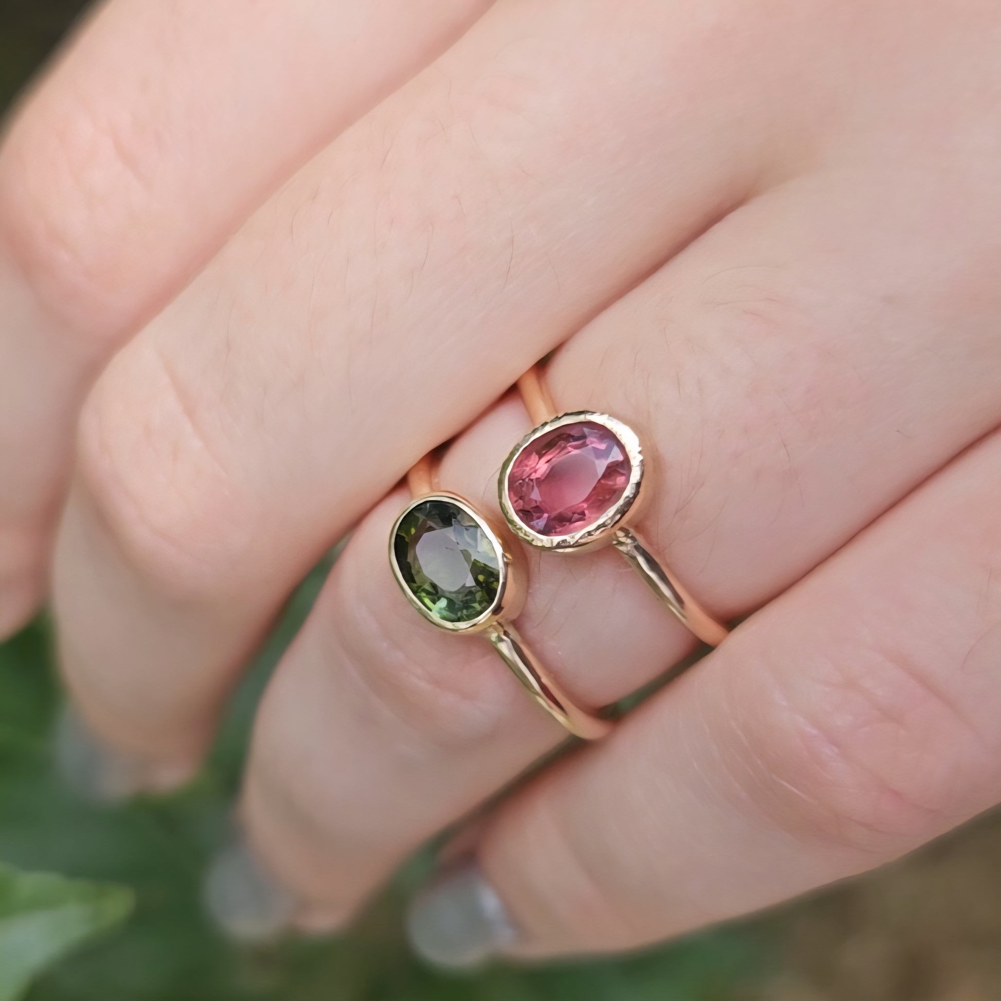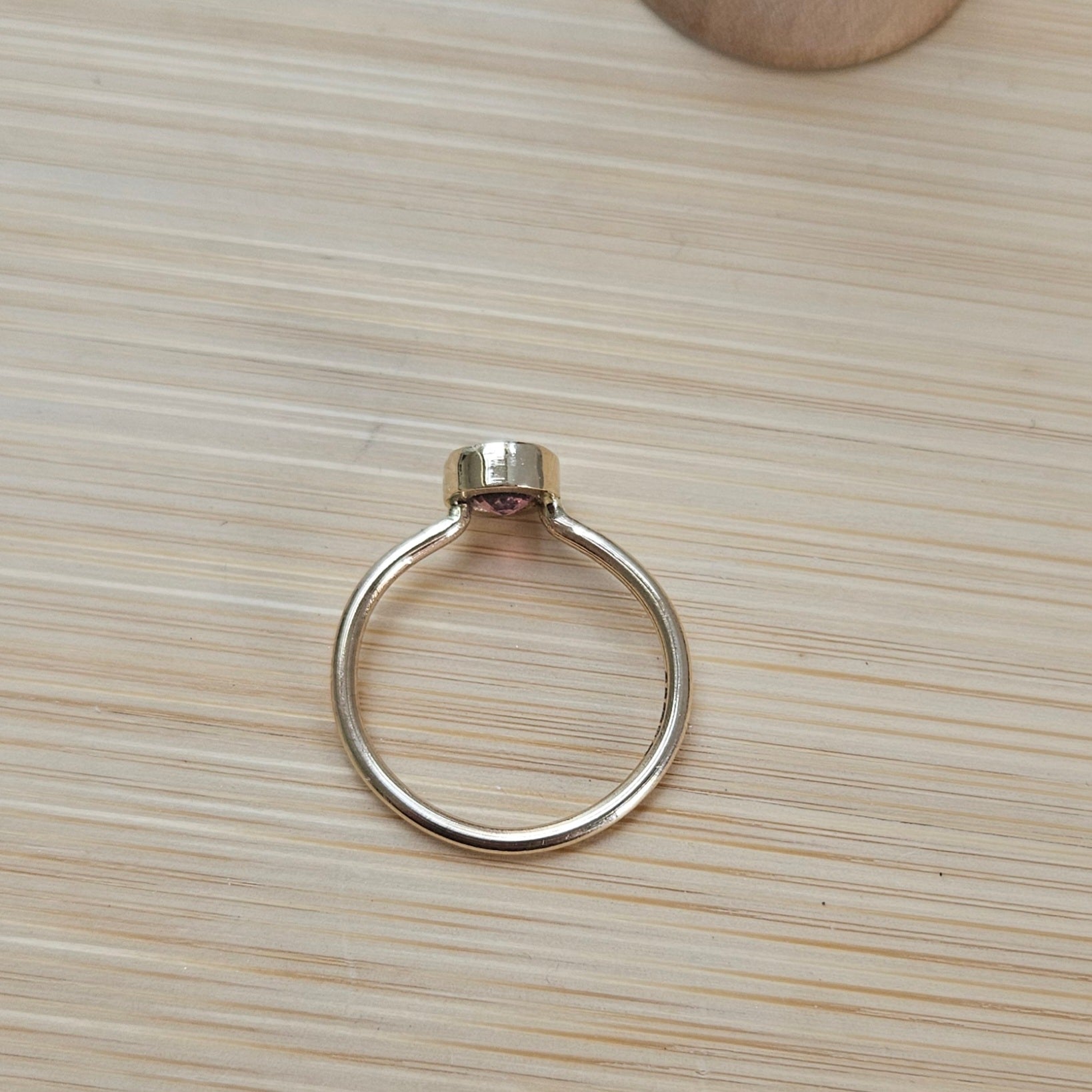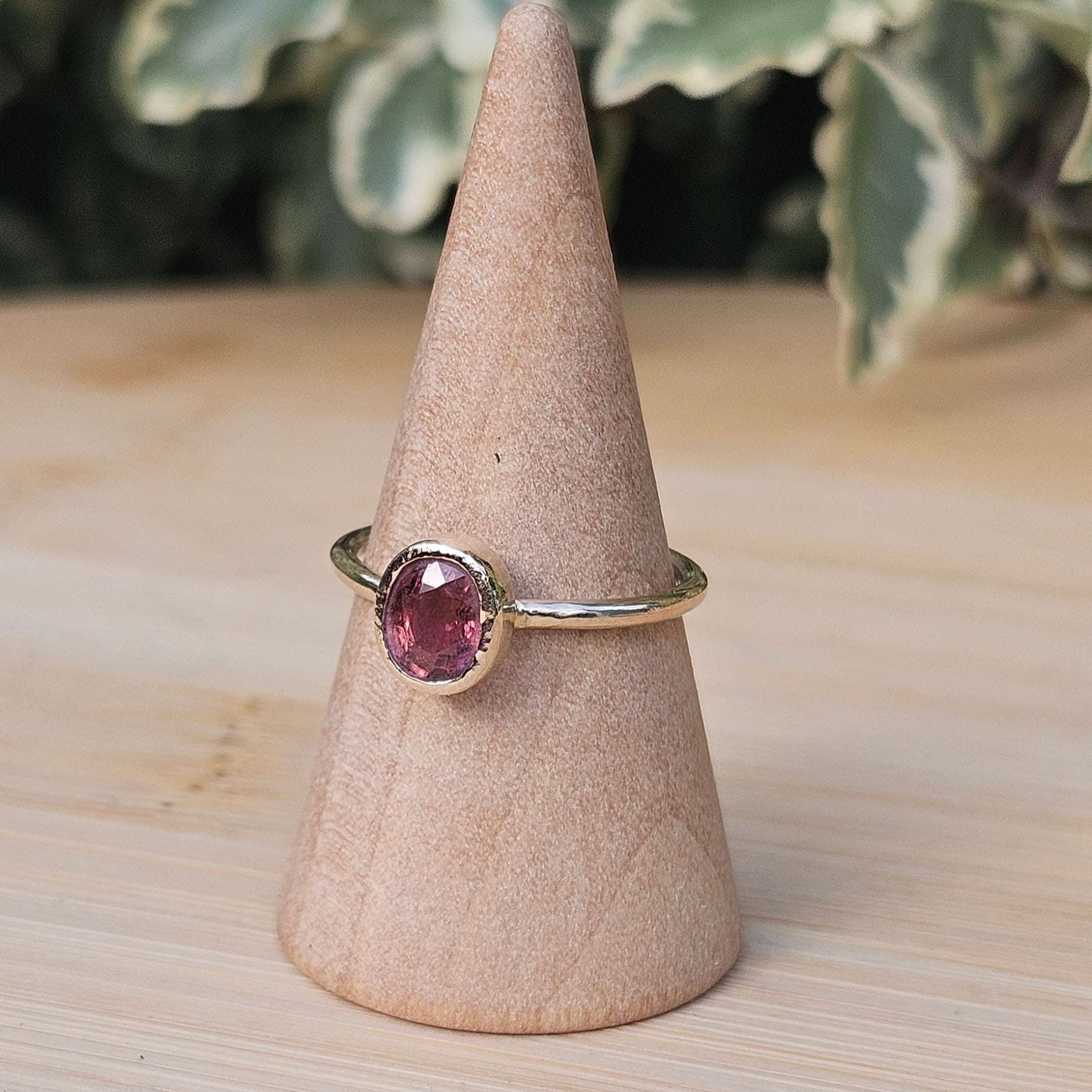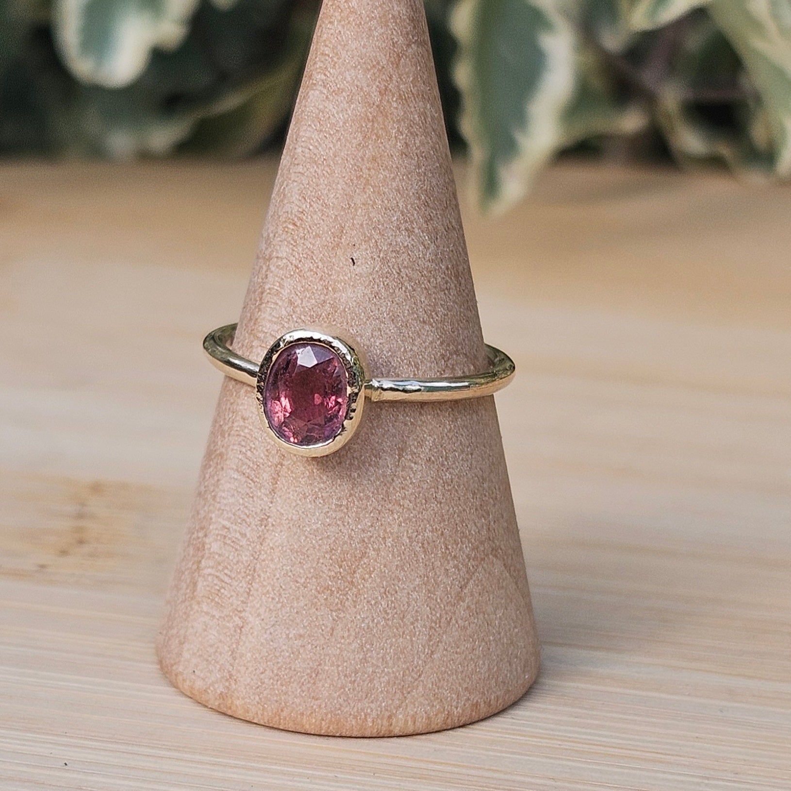 14 ct gold pink tourmaline ring with hammered bezel. Open back.