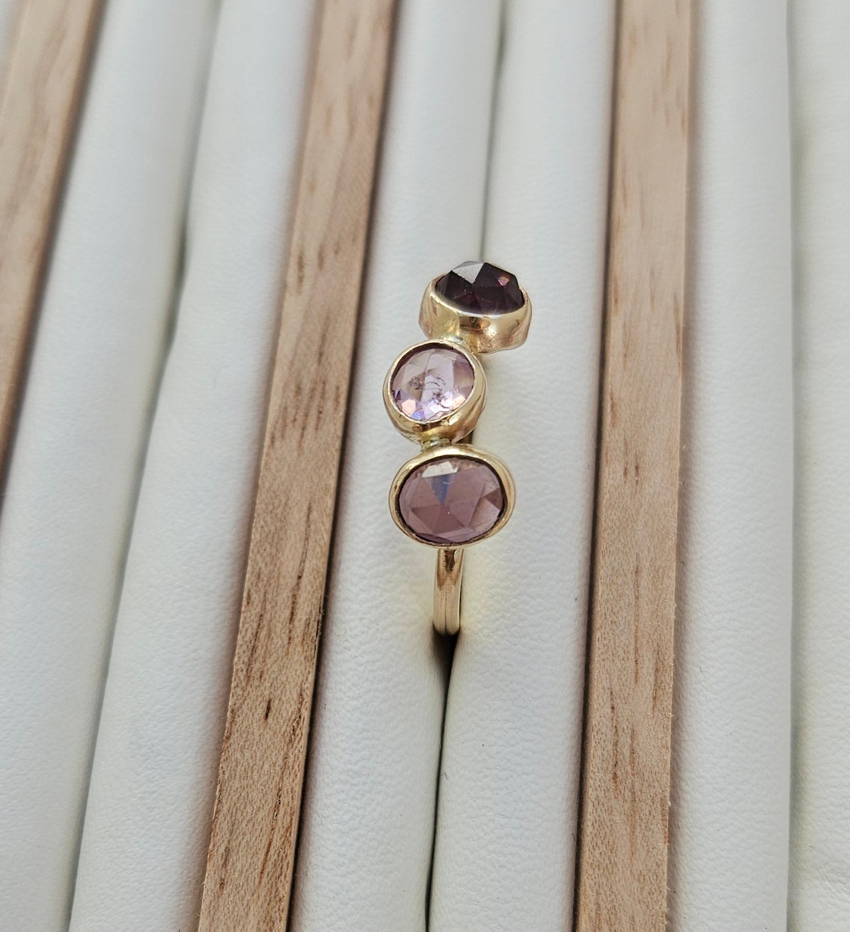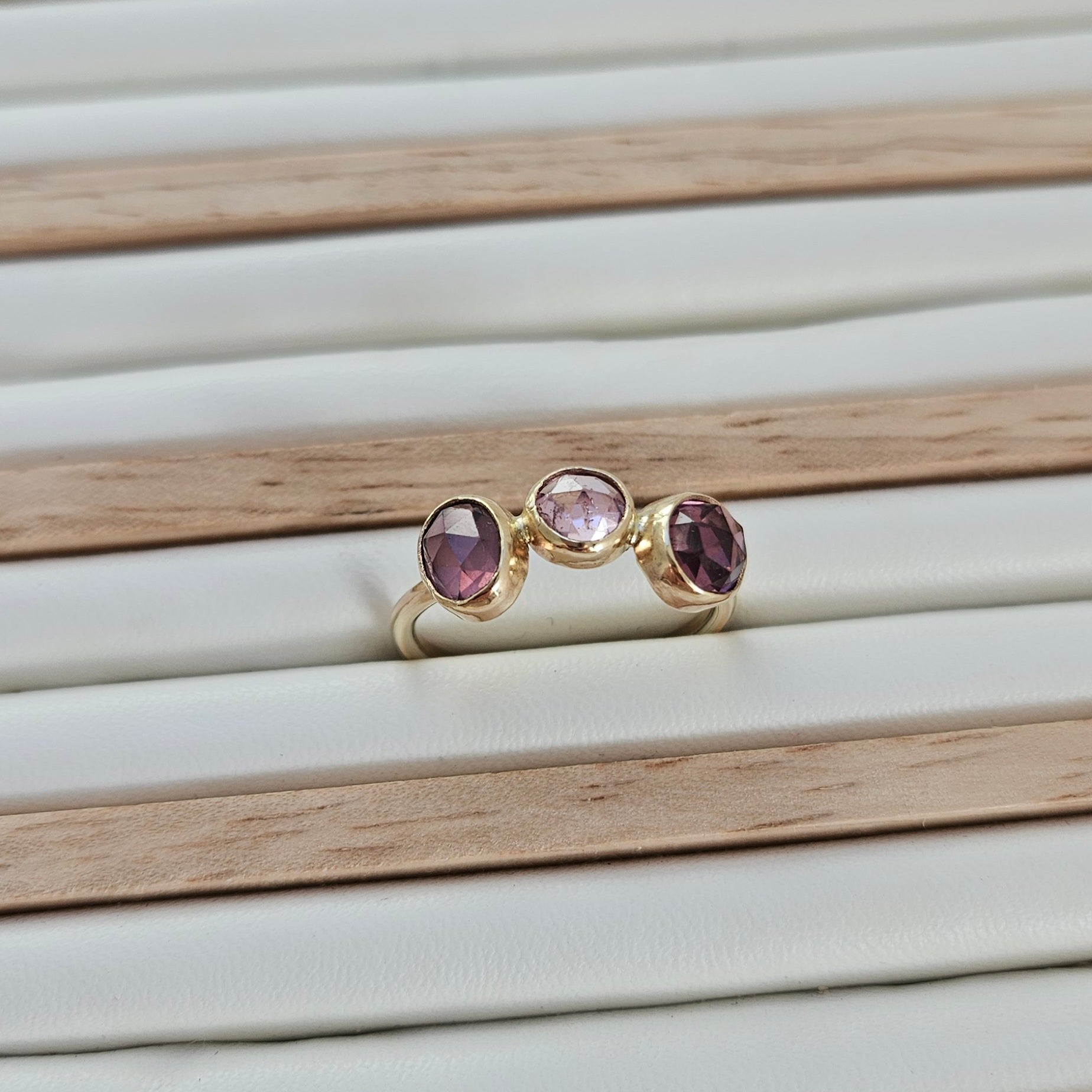 Three natural spinels in soft lilac and plum, set in a 9ct gold band. Asymmetric and effortlessly elegant.