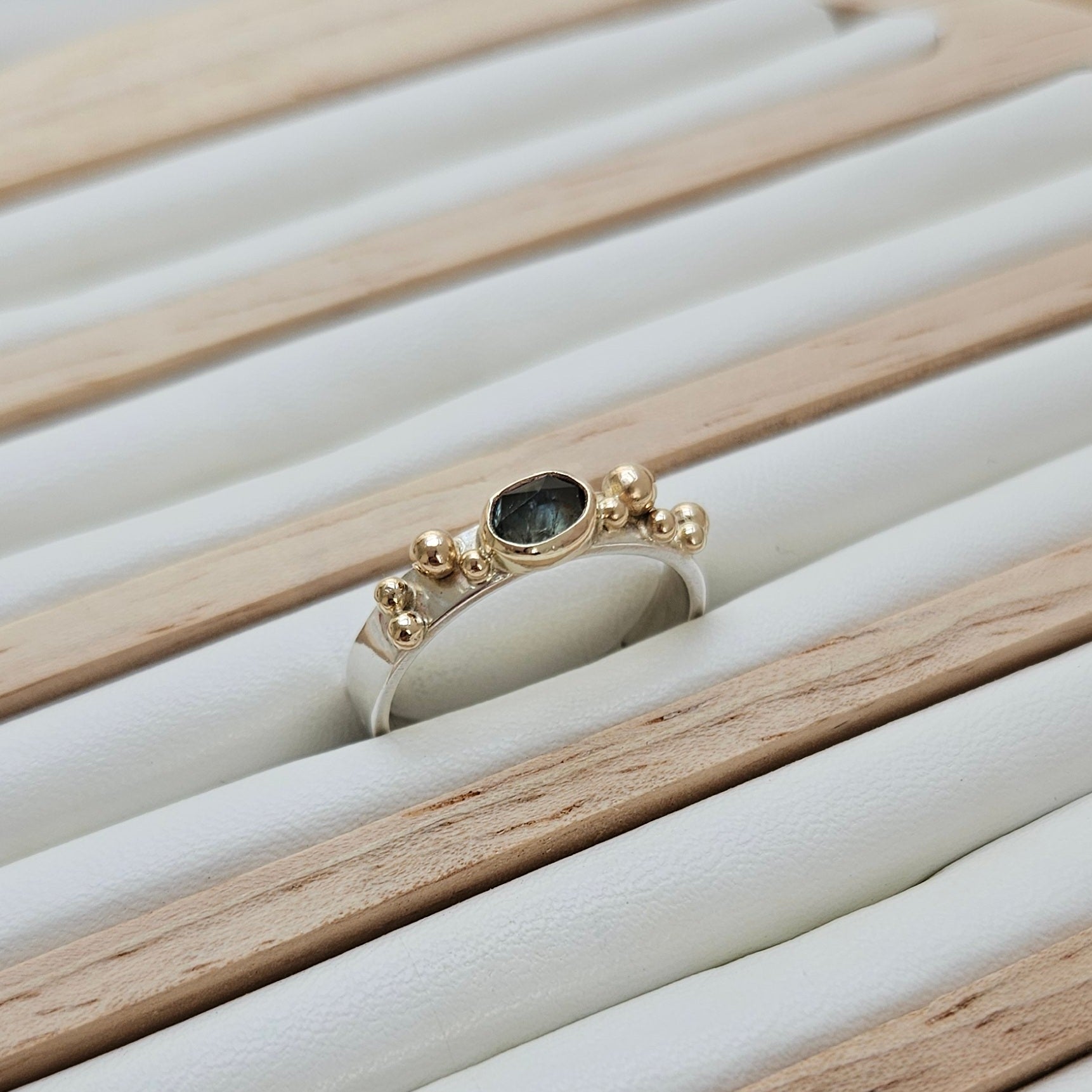 Green sapphire ring with 9ct gold bezel and granulation detail on a 3mm sterling silver band.