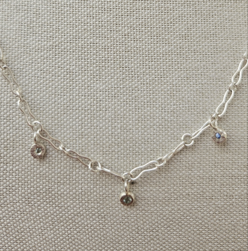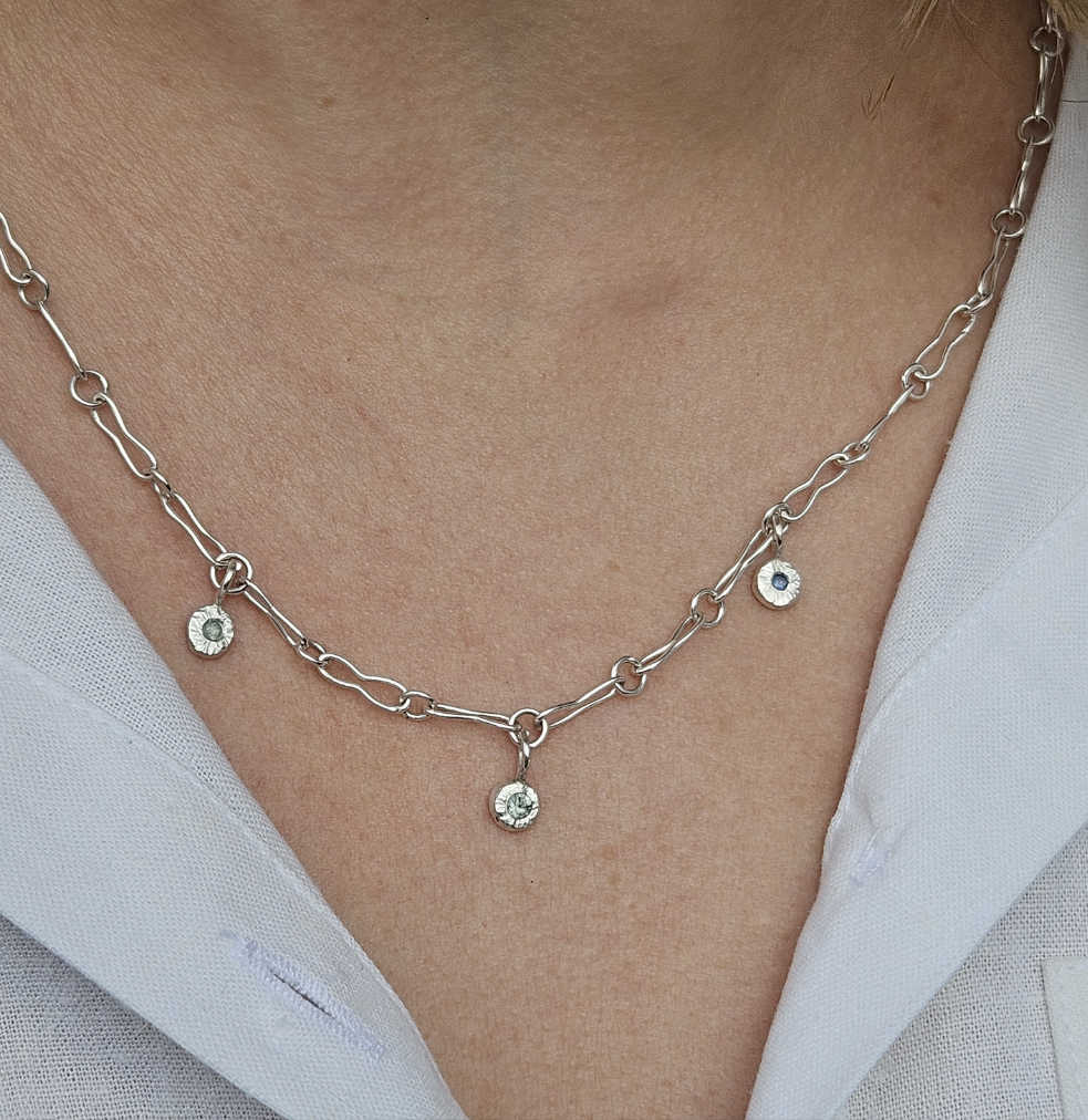 Featuring 3 attached charms with a 3mm sapphire in each one.