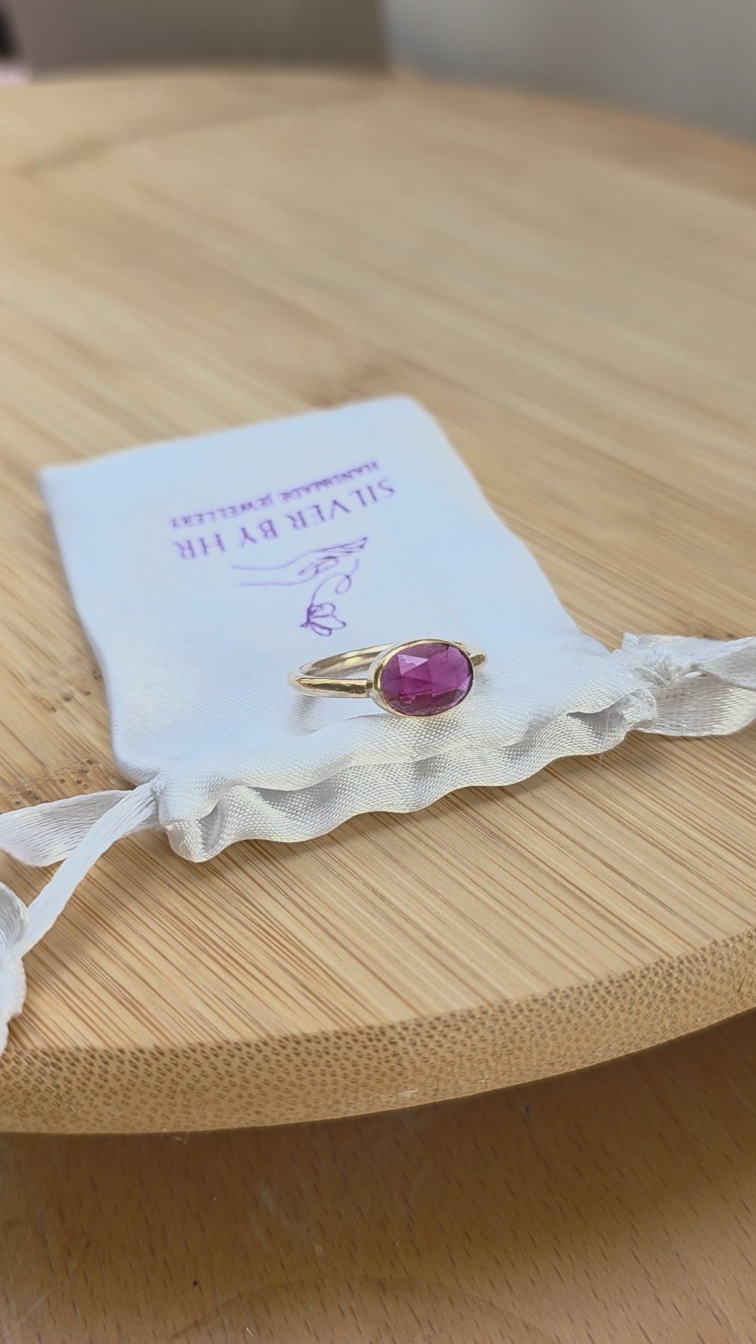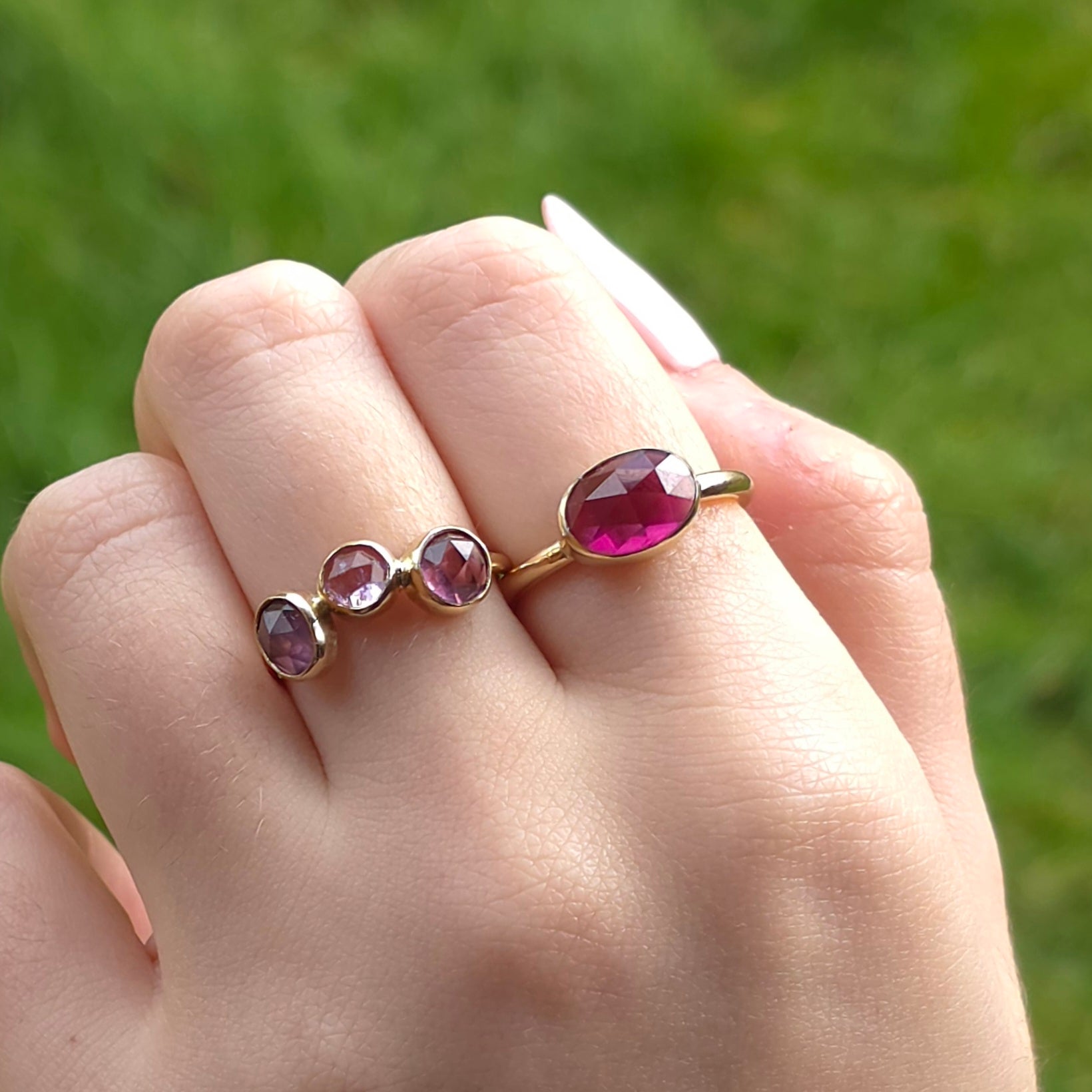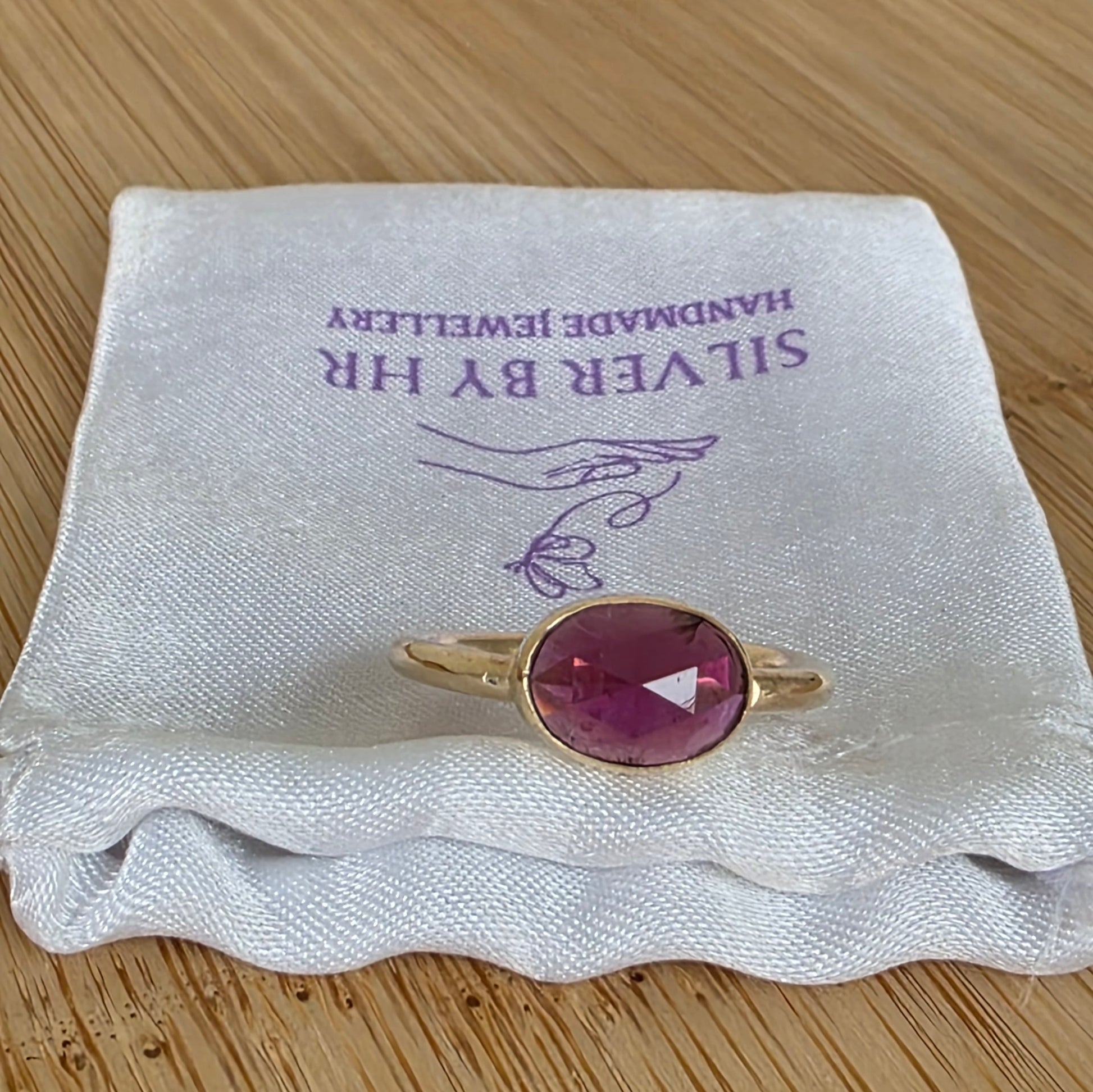A soft raspberry coloured rhodolite garnet,set in 9ct recycled gold.