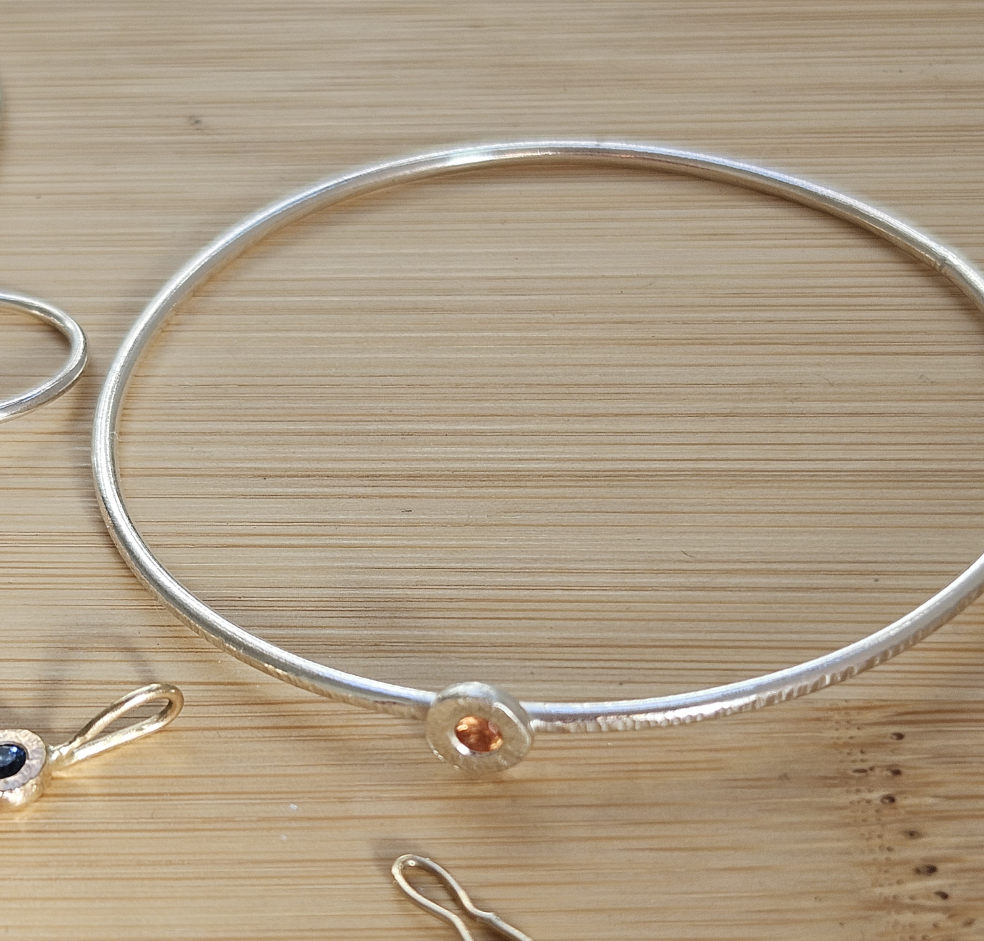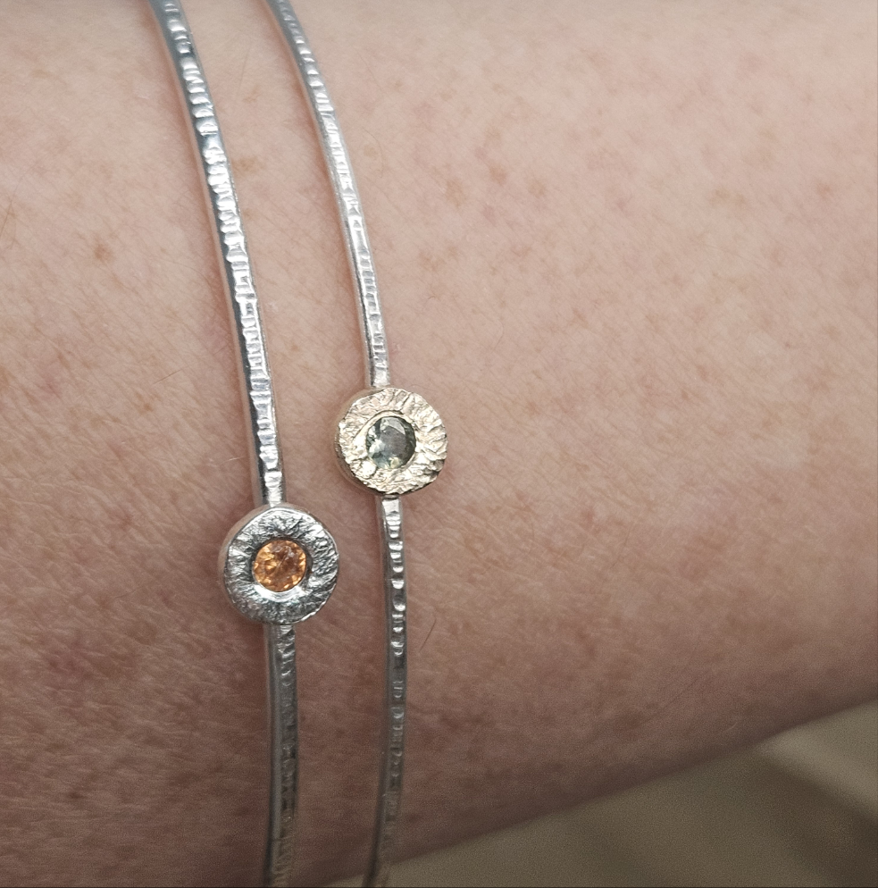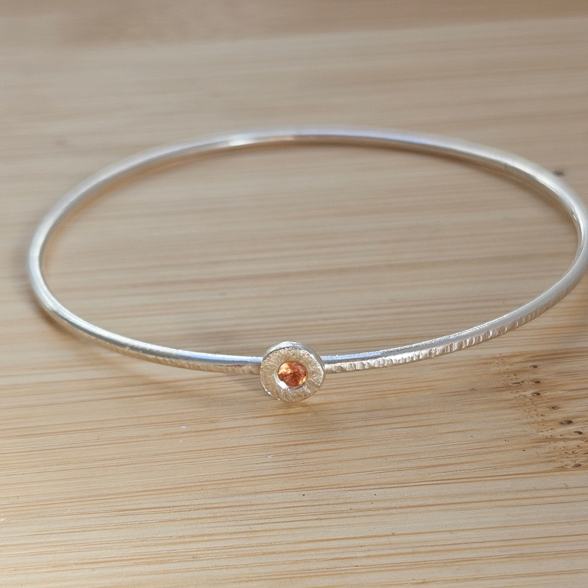Sterling silver bangle with a hammered effect, featuring a 3mm sapphire, also in a hammered setting.