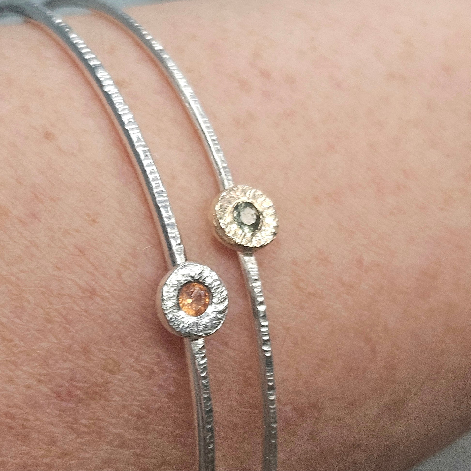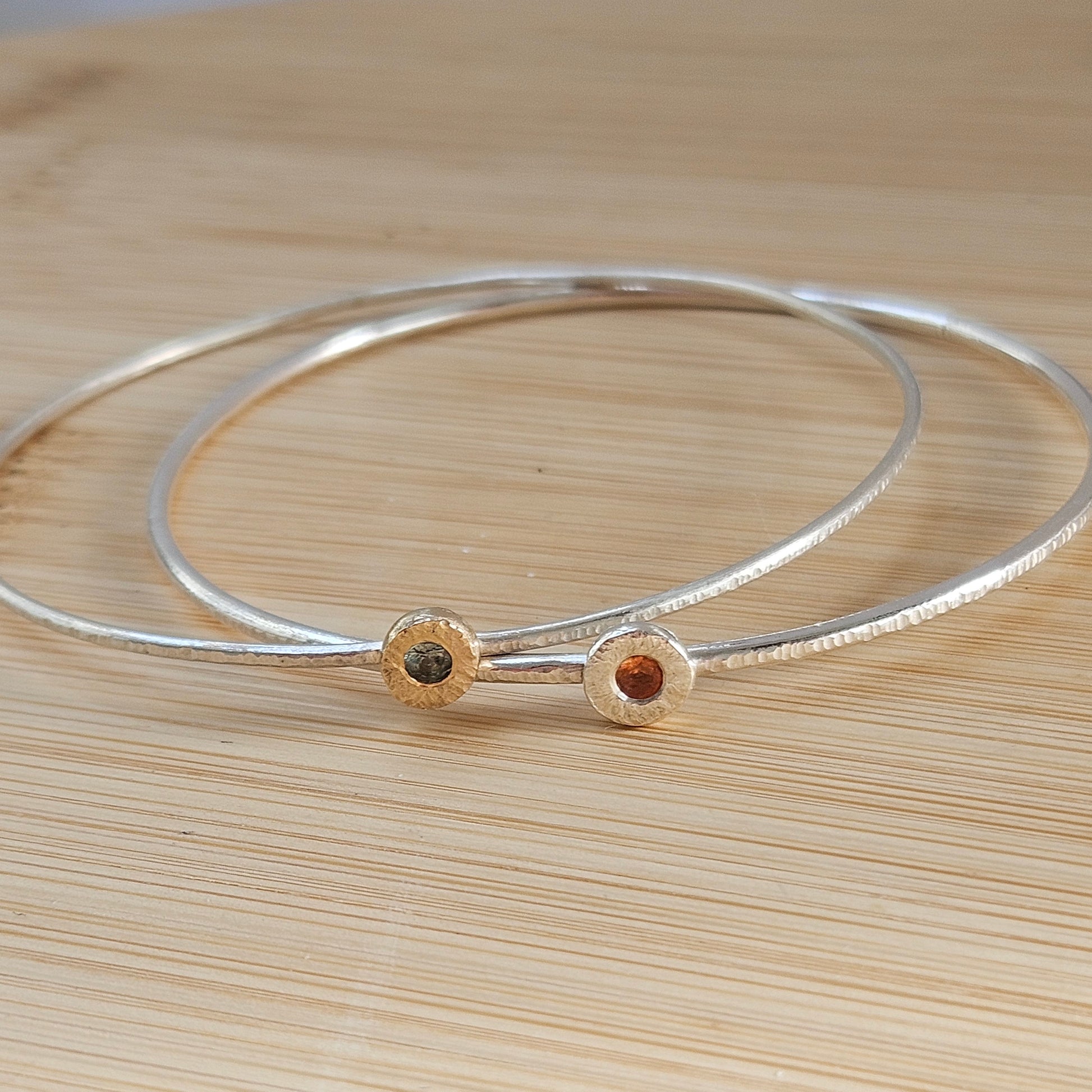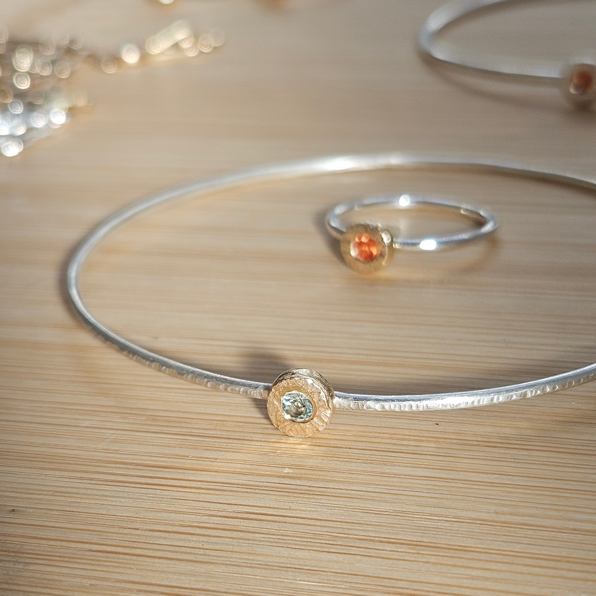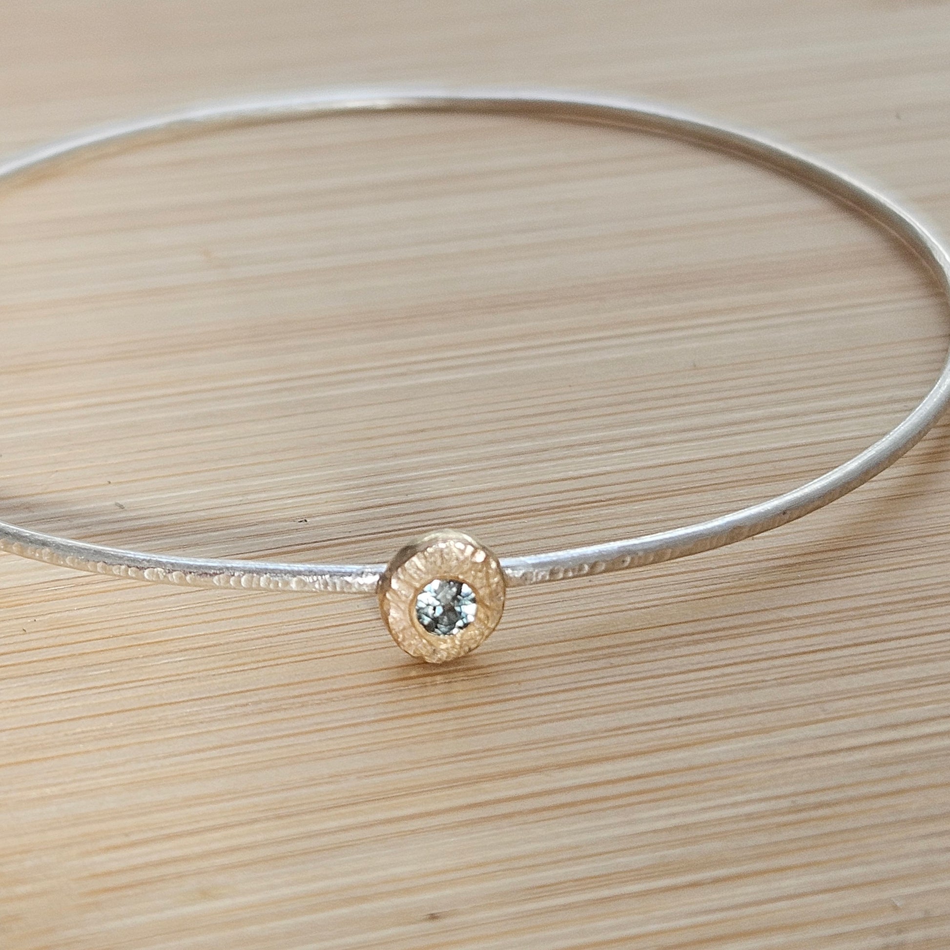 Sterling silver bangle with a 9ct gold hammered setting with a 3mm sapphire.