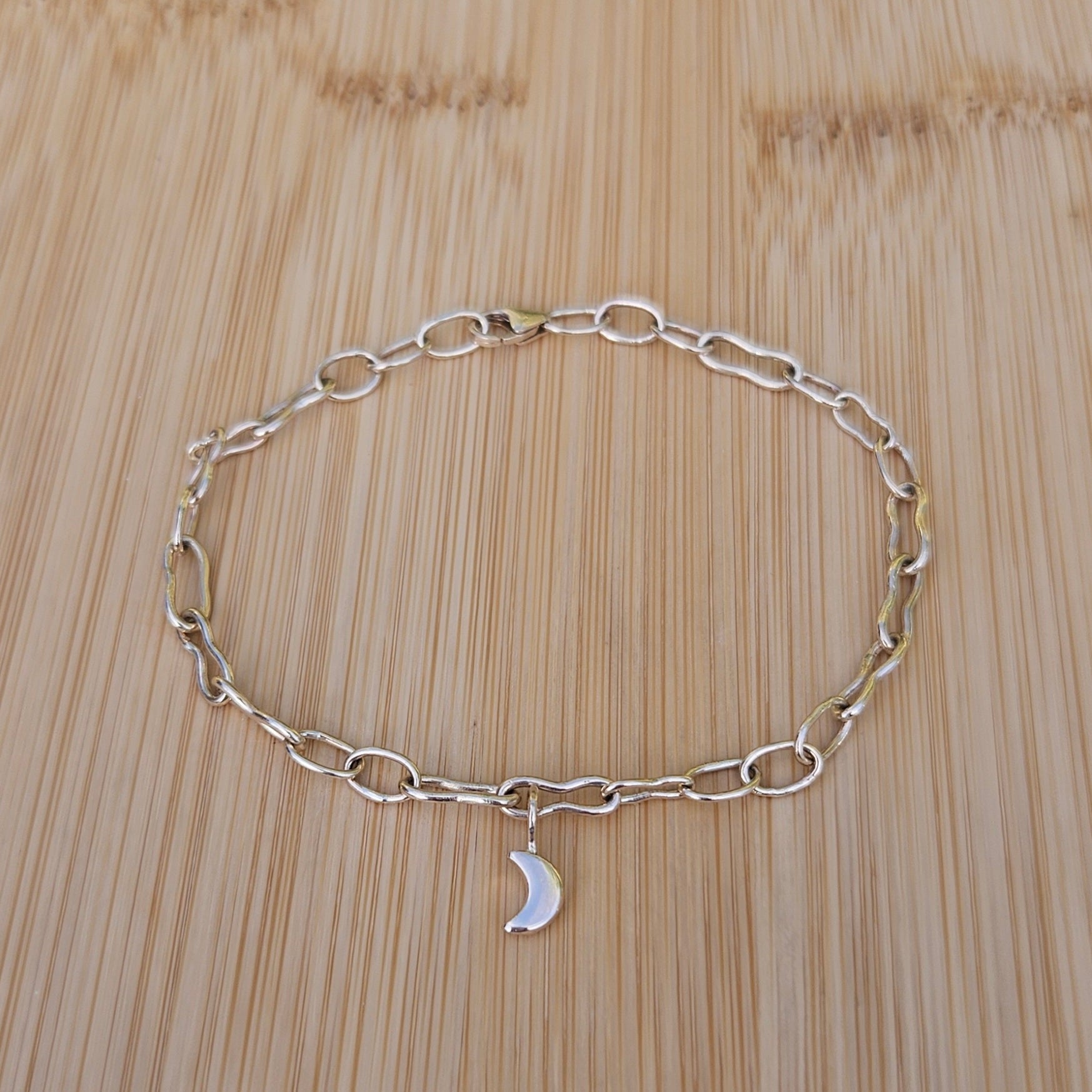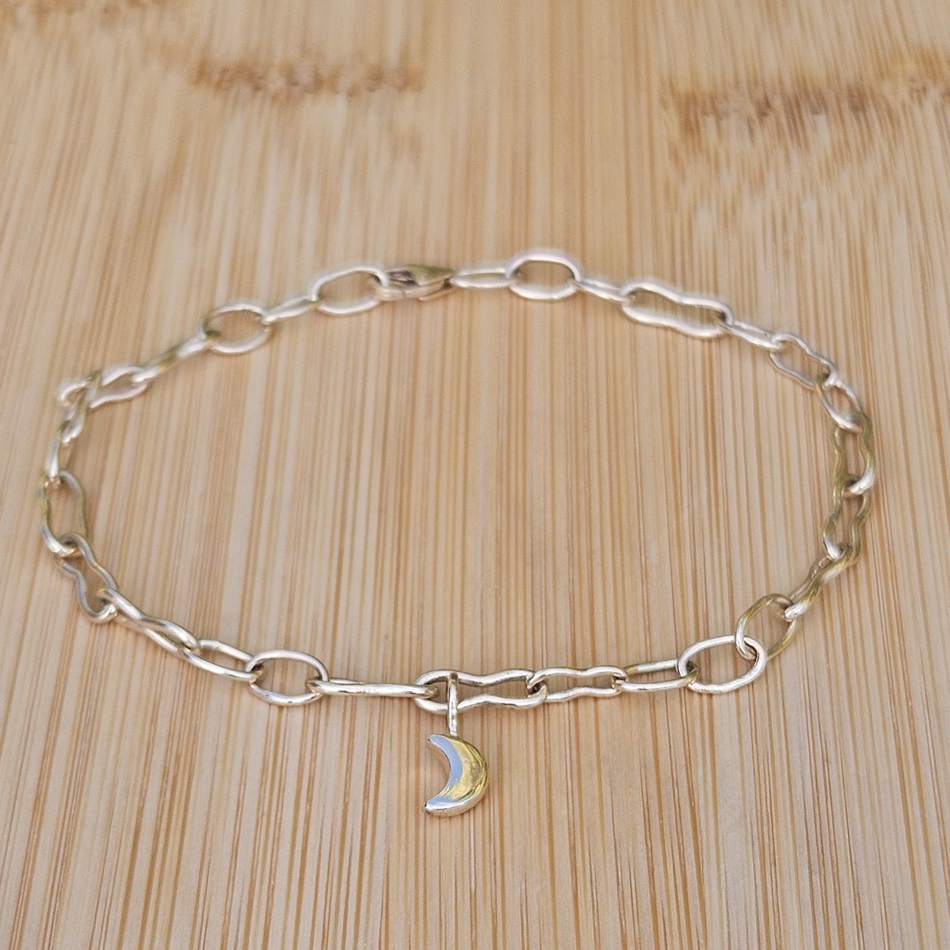 Handmade in 9ct gold with softly irregular links and a delicate crescent moon charm. A subtle, timeless piece for everyday wear.