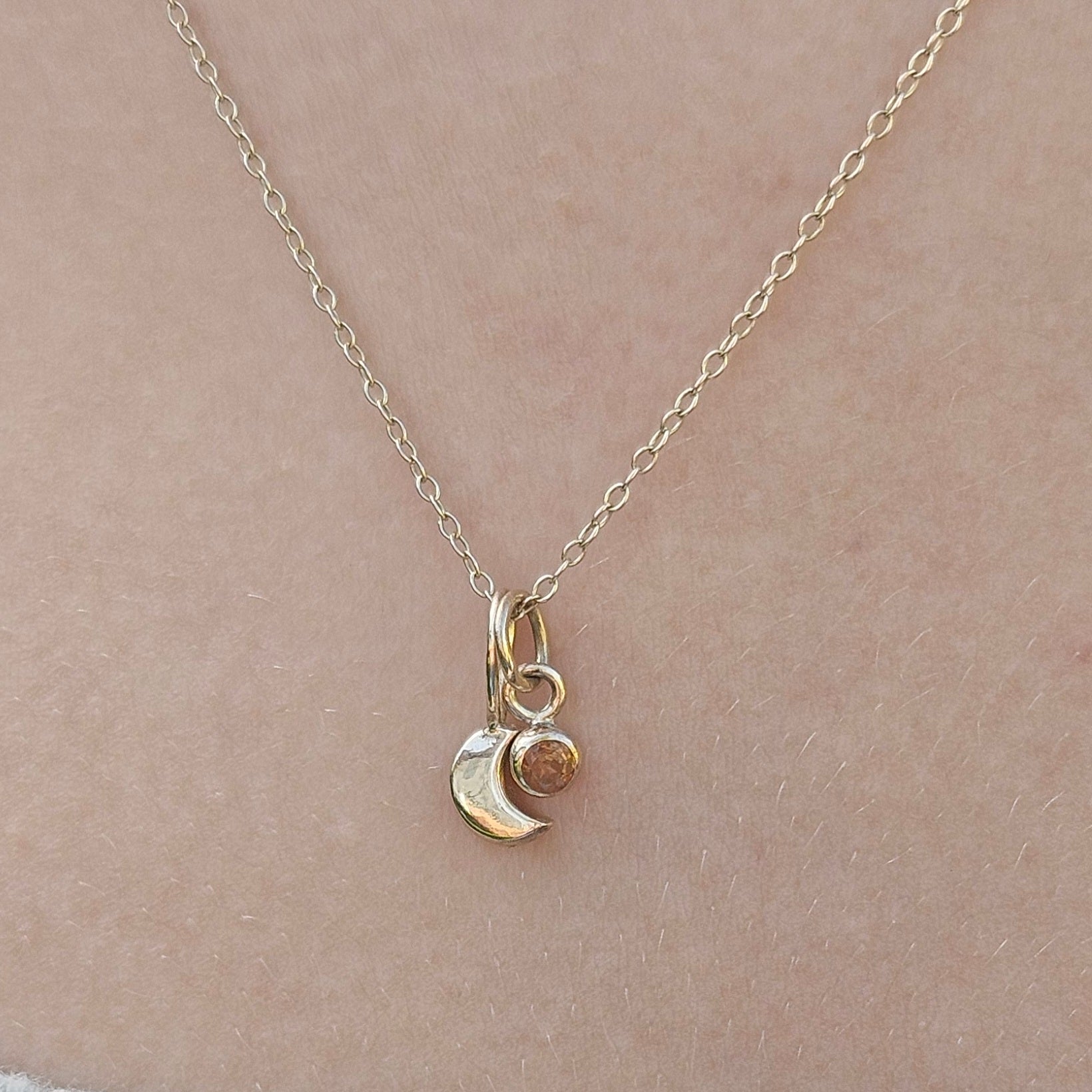 A handmade 9ct gold crescent moon paired with a tiny orange sapphire charm — a symbol of light, warmth, and new beginnings.
